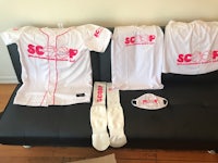 Females pink and white jersey combo set jersey, tank top, head band ,socks.mask,skirt